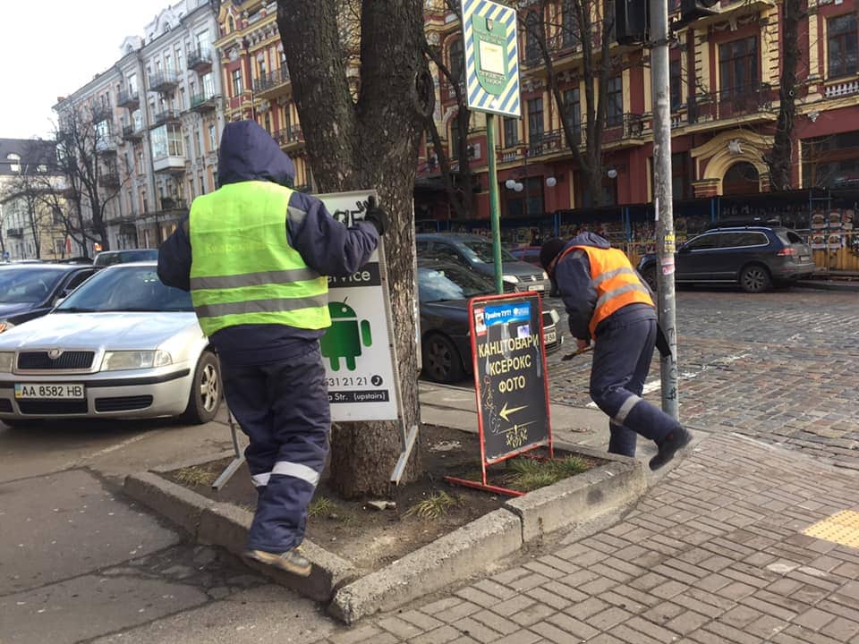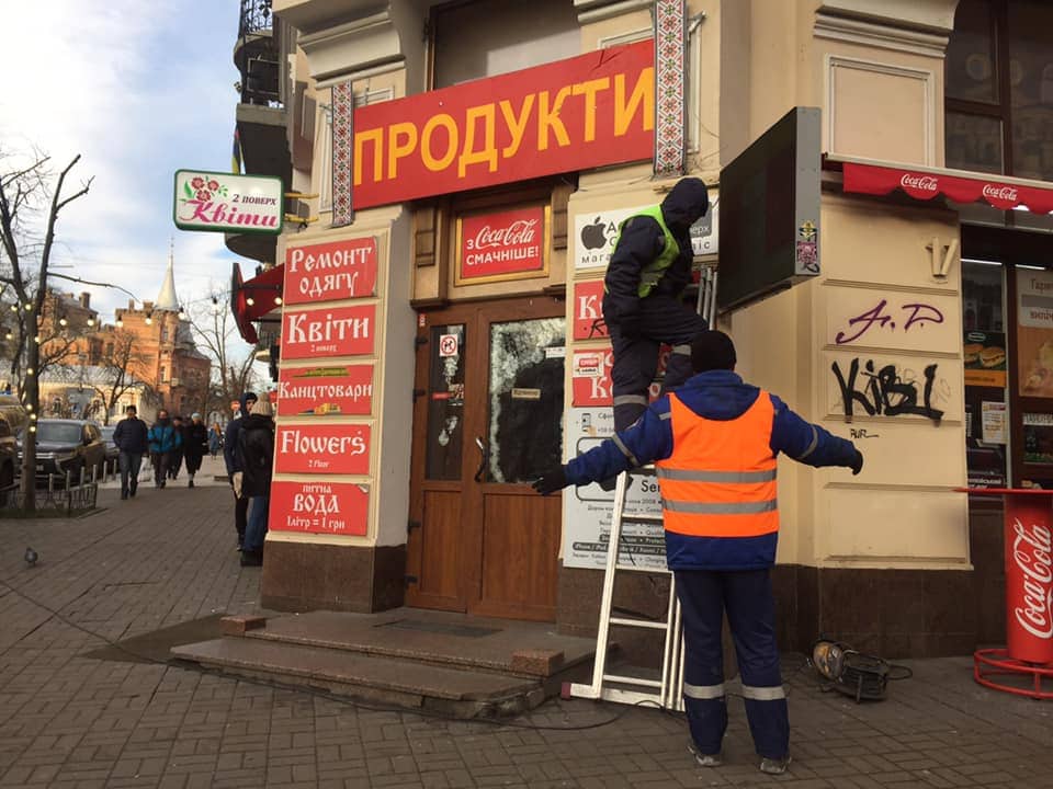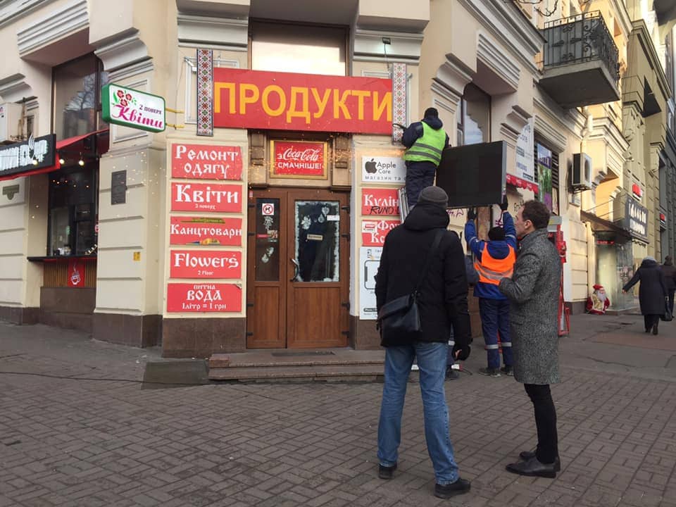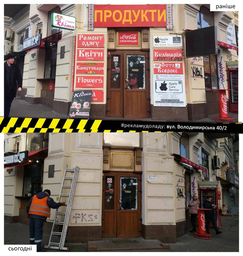Всього було демонтовано 25 рекламних конструкцій: 20 з фасаду будинку та ще 5 на тротуарі поруч. Прикрий факт: рекламу з будинку демонтують вже повторно.