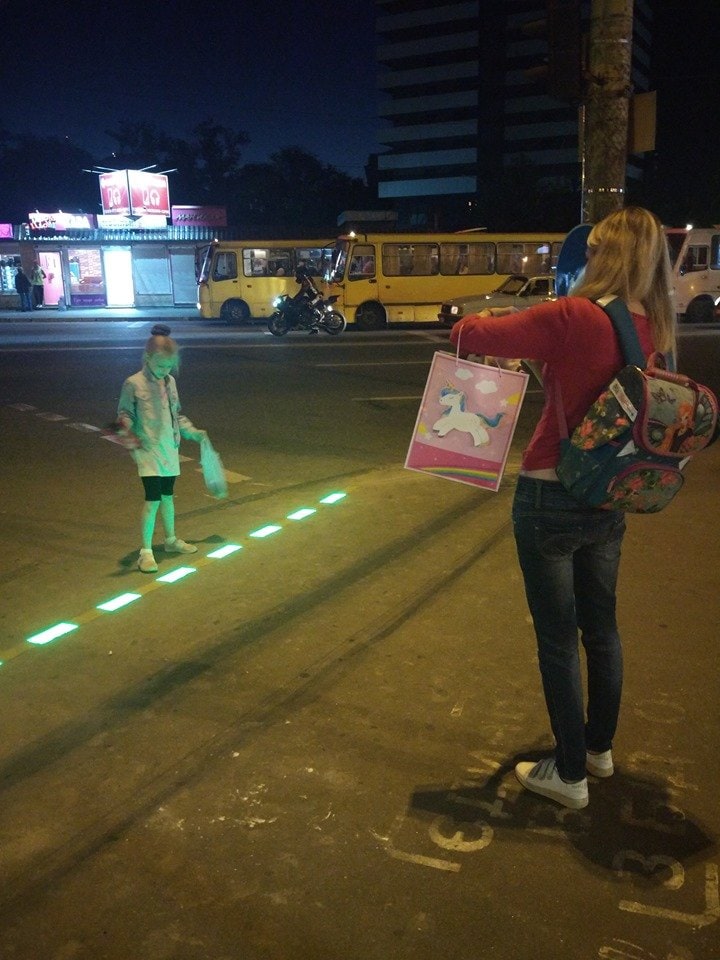 Межі пішохідного переходу позначено відповідною дорожньою розміткою – «LED-бруківкою». Вони реагують на сигнал світлофору та змінюють свій колір з червоного на зелений.