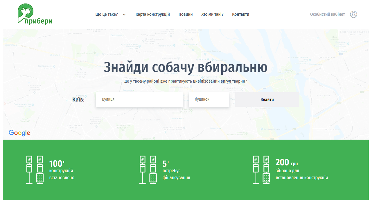 Як показало опитування, створене організацією в березні цього року, 68% опитаних киян не знають, де знаходяться обладнані спеціальними скриньками території цивілізованого вигулу собак в місті. Саме тому активісти вирішили змінити цю ситуацію і створити карту, де кожен зміг би знайти цілковиту інфраструктуру спеціальних урн «Собача Вбиральня».