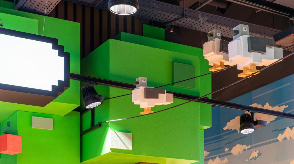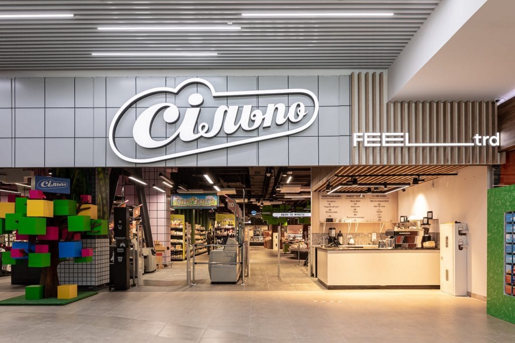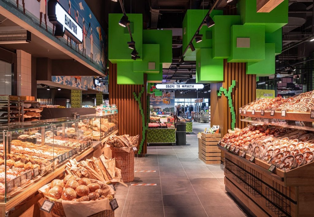 За задумом, 1170 м² торгового залу ― це гра-бродилка від гаю до моря через гори й скелі. Біля фруктів та овочів крізь піксельні дерева й виглядають піксельні голуби. А над усім цим пролягає перегонова траса.