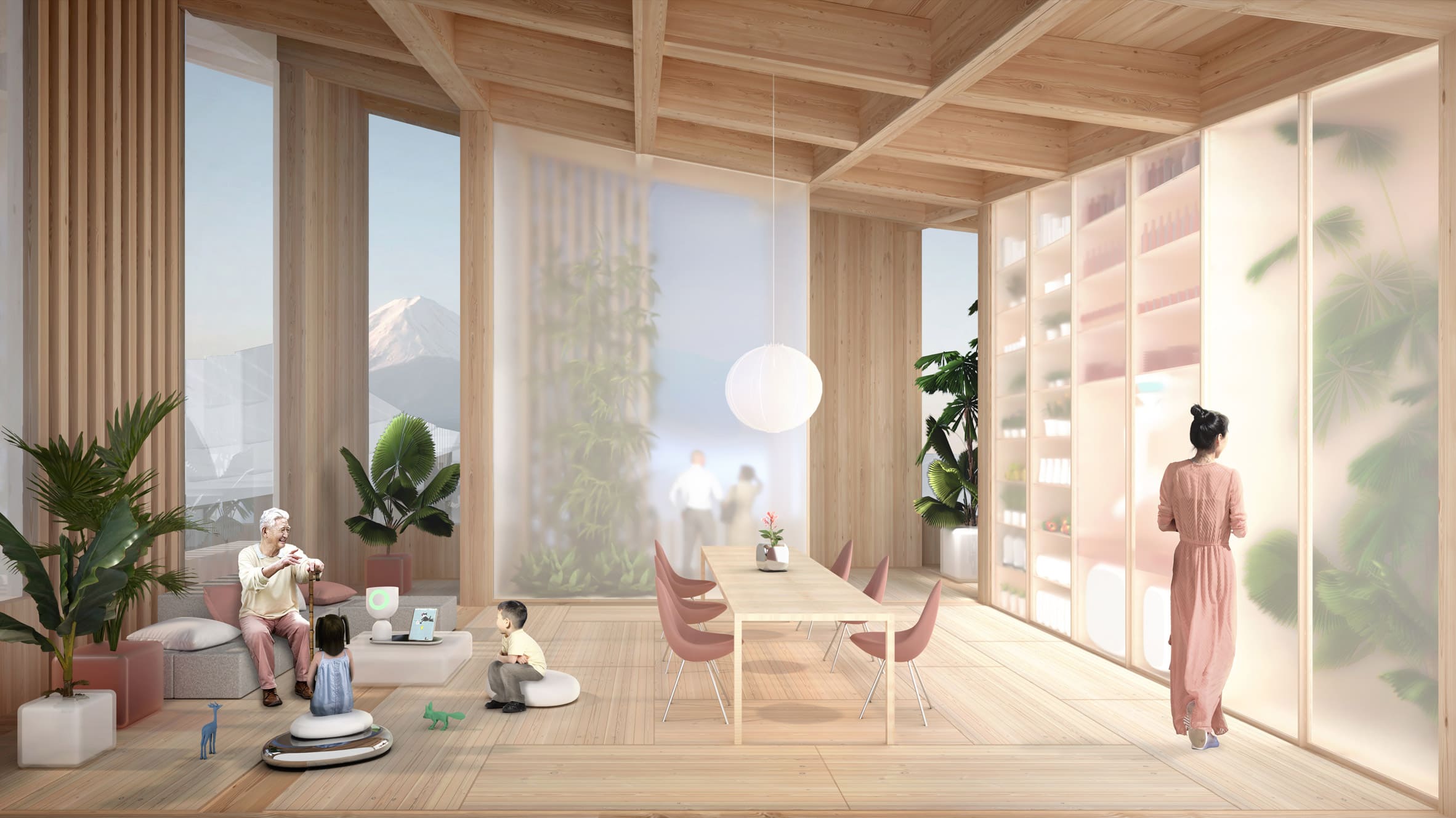 Усі будинки будуватимуть з лісоматеріалів. Сонячні панелі встановлять на кожному дасі. В усіх житлових будинках у Woven City будуть роботи та підключені до штучного інтелекту сенсори для перевірки здоров’я мешканців.