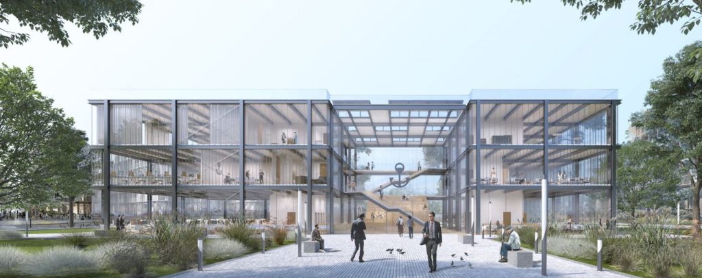 Це будівля відкритого планування, що складається з двох просторових об’ємів, з’єднаних між собою великим атріумом, де розташовані амфітеатр і відкриті сходи. Вона матиме 4 поверхи.