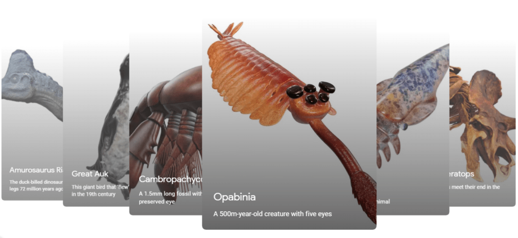 Користувачам пропонують подивитися на кембропахікопа — ракоподібну істоту 1,5 мм, егірокассіса, що жив 480 мільйонів років тому, рибу-фільтрувальника або найбільшу тварину, що коли-небудь жила на Землі.