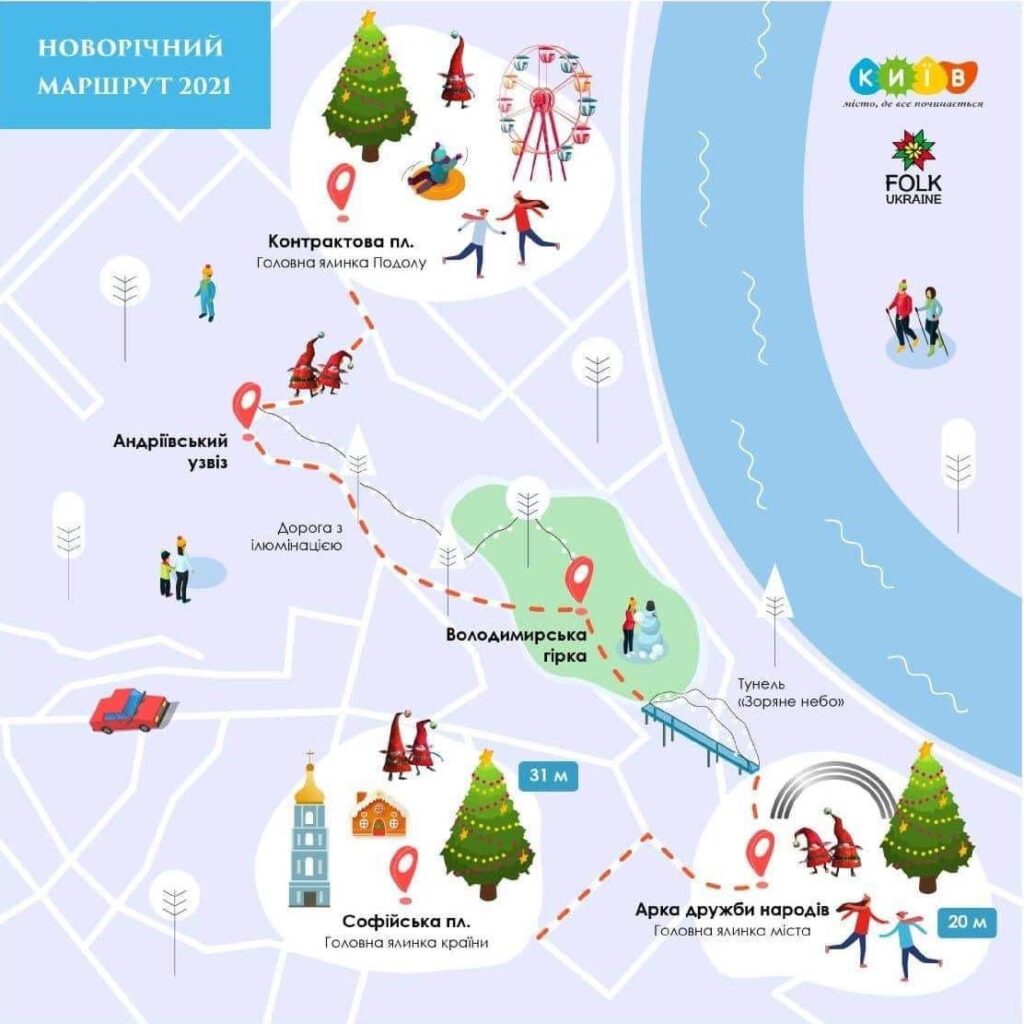 Три ялинки встановлять на Софійській площі, біля Арки дружби народів та на Контрактовій площі. Їх об’єднають восьмикілометровим прогулянковим маршрутом.
