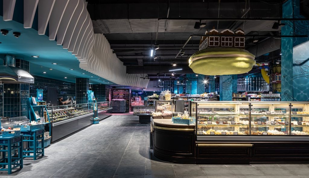 Над відділом «Власної кондитерської» три кити тримають світ ― цукерки «Вулкан», макарун і будинок із печива.
