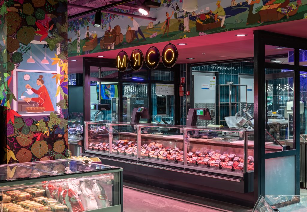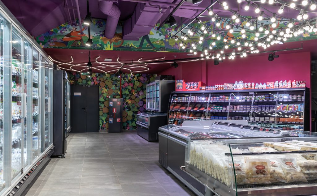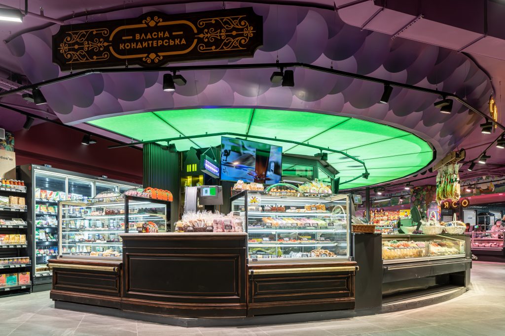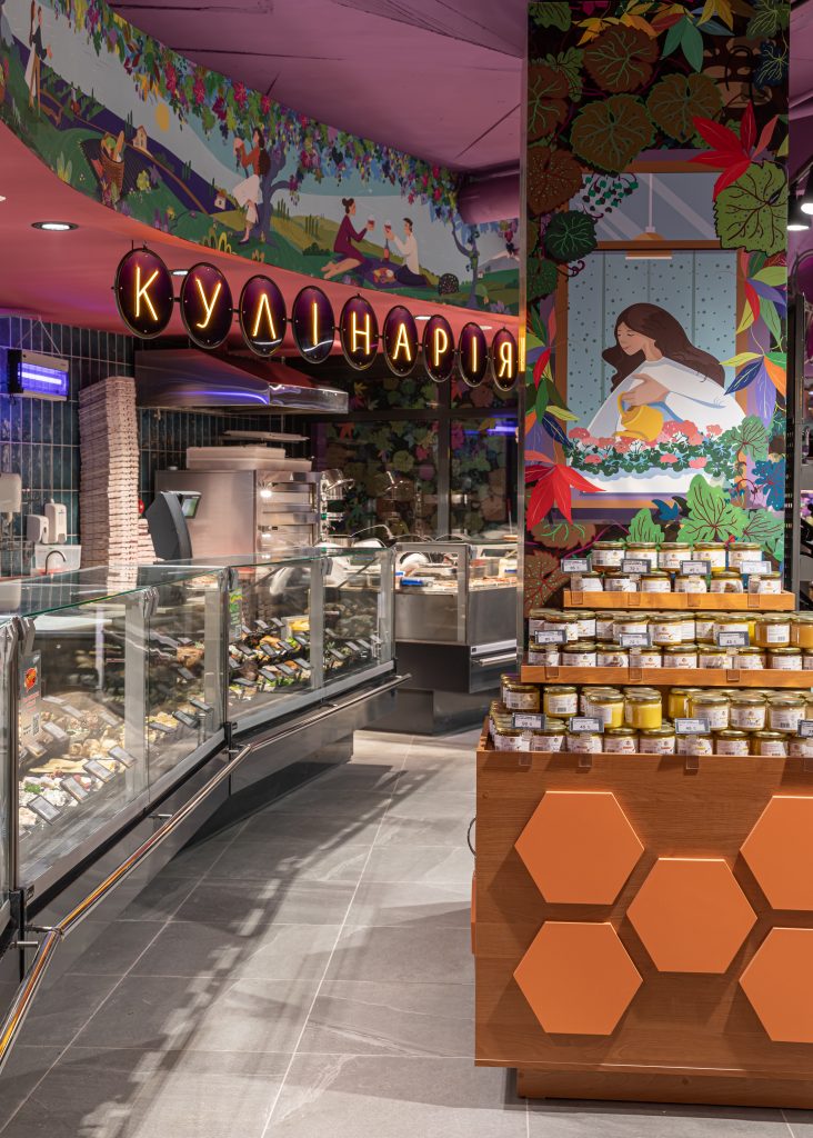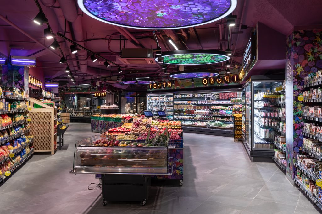 У залі у спеціальних діжках виграють червоне, біле й рожеве вино, а у відділі овочів та фруктів під стелею розміщені чотири світлових кола, присвячених різним сортам винограду.