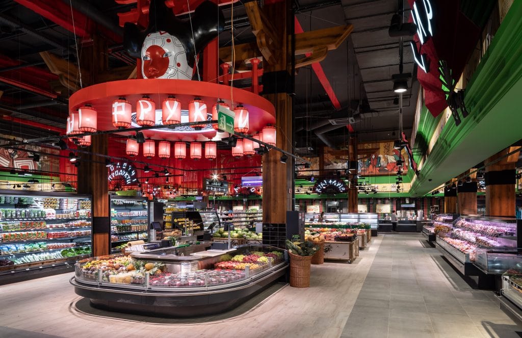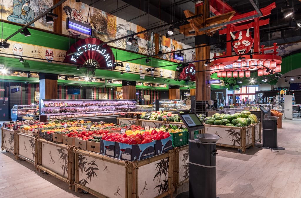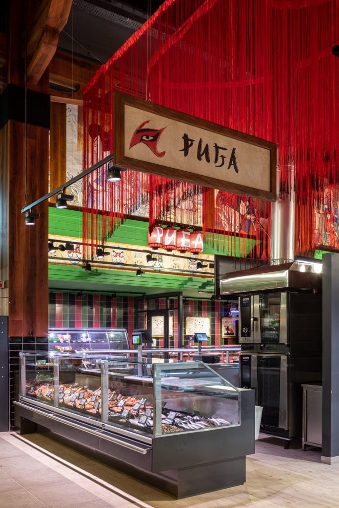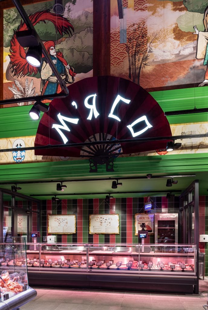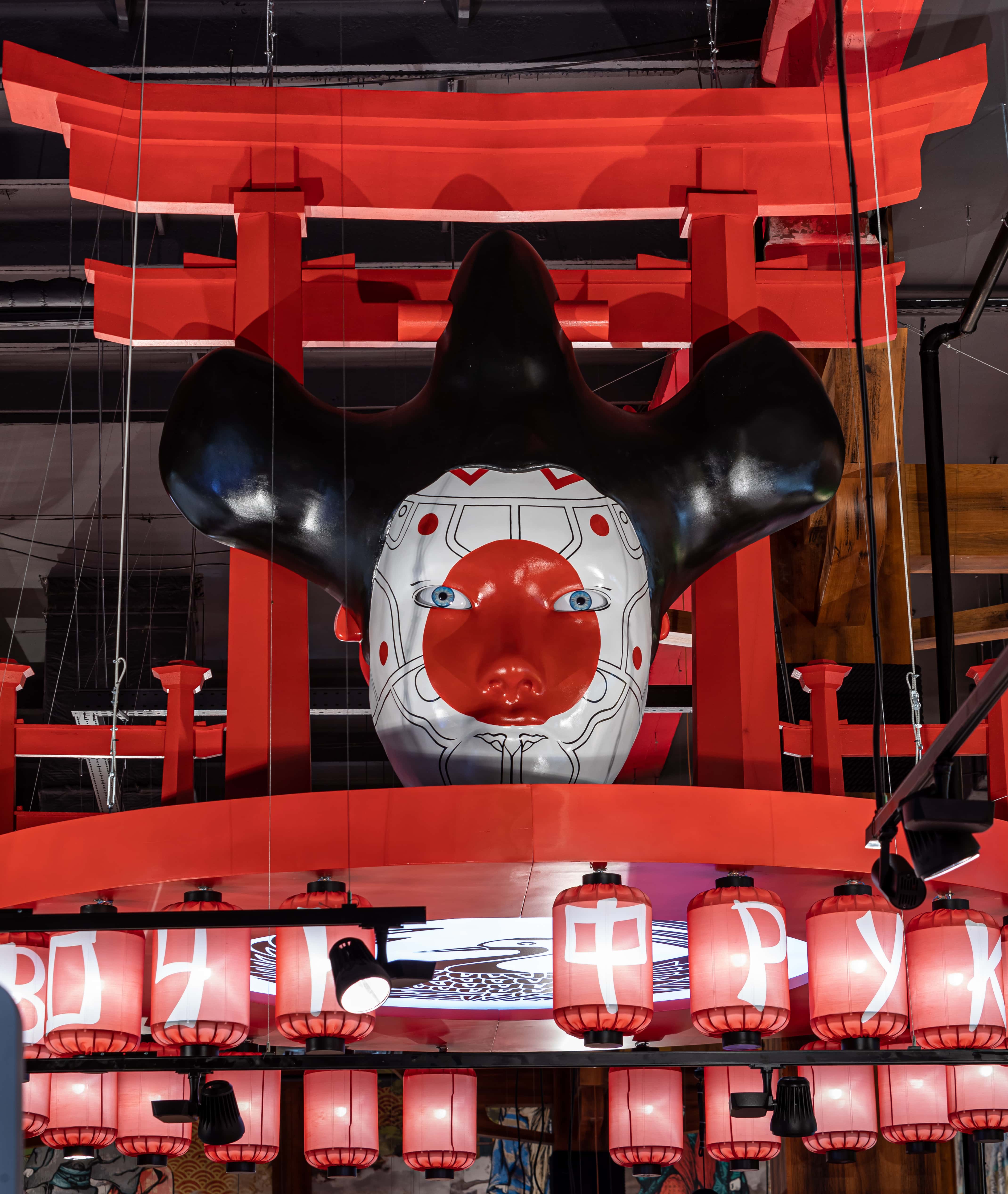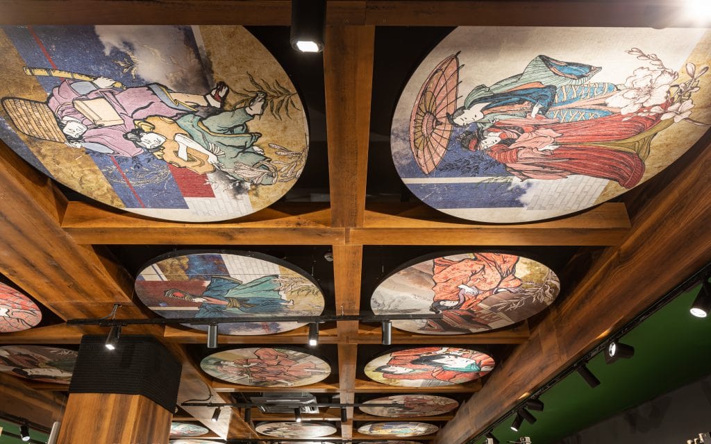 На 1425 м2 торгового залу сховано 5 класичних п’єс Кабукі ― фрески, описи та відомі сцени. Знизу під кожною ― нотний стан мелодії та театральні маски, що відповідають настрою п’єси.