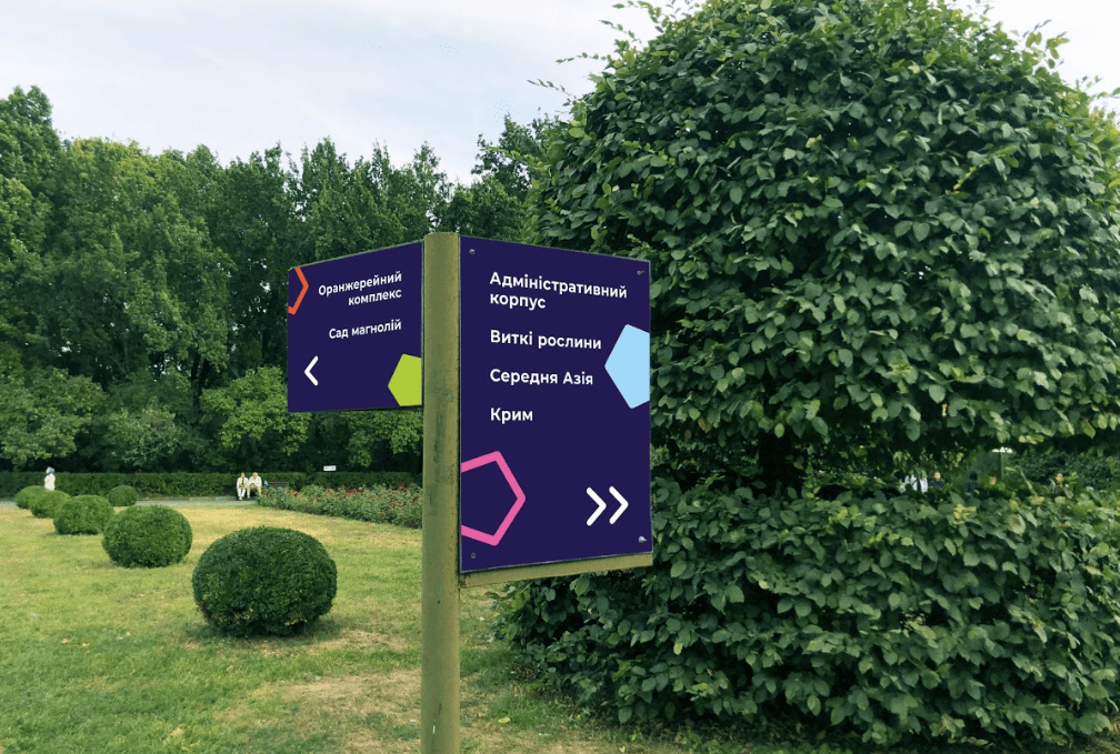 Далі агенція змінила знак ботсаду — п’ятикутник. Ця фігура зустрічається у рослинах, квітах та у конструкції куполу головної оранжереї ботсаду.