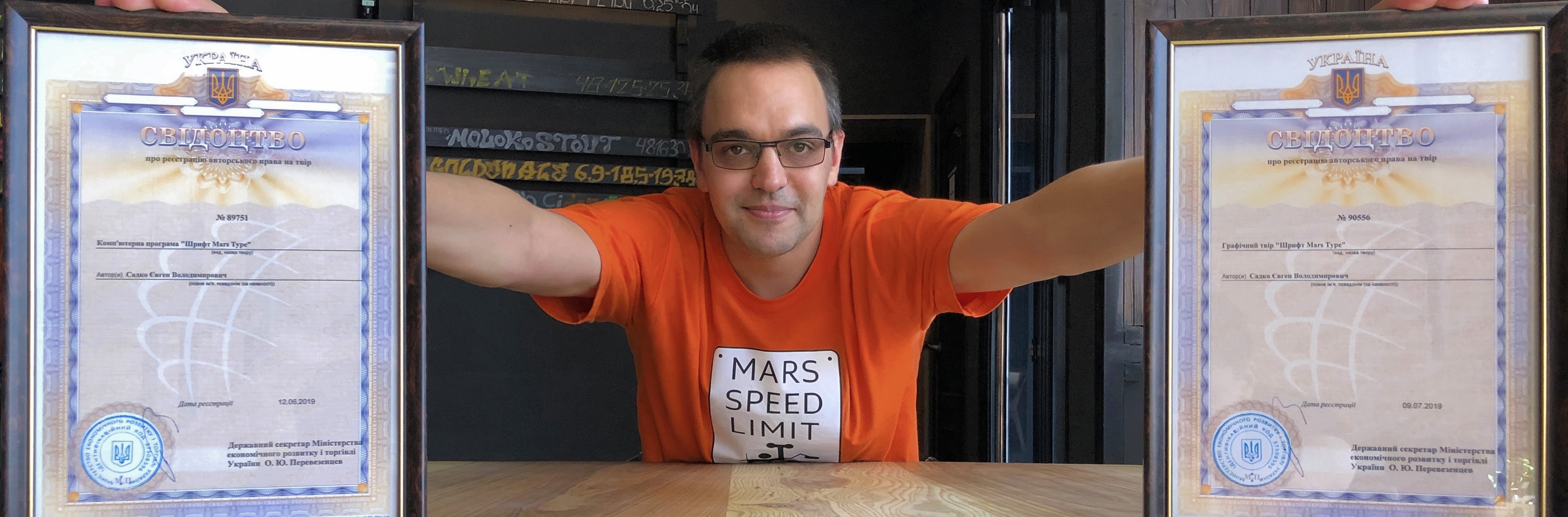 В Україні зареєструвати шрифт можна як комп’ютерну програму та як графічний твір, тому Mars Type отримав цілих два свідоцтва. Автор розповів, що без складнощів не обійшлося, бо спочатку Міністерство відмовлялося визнавати шрифт твором, оскільки у них немає процедури експертизи шрифту.