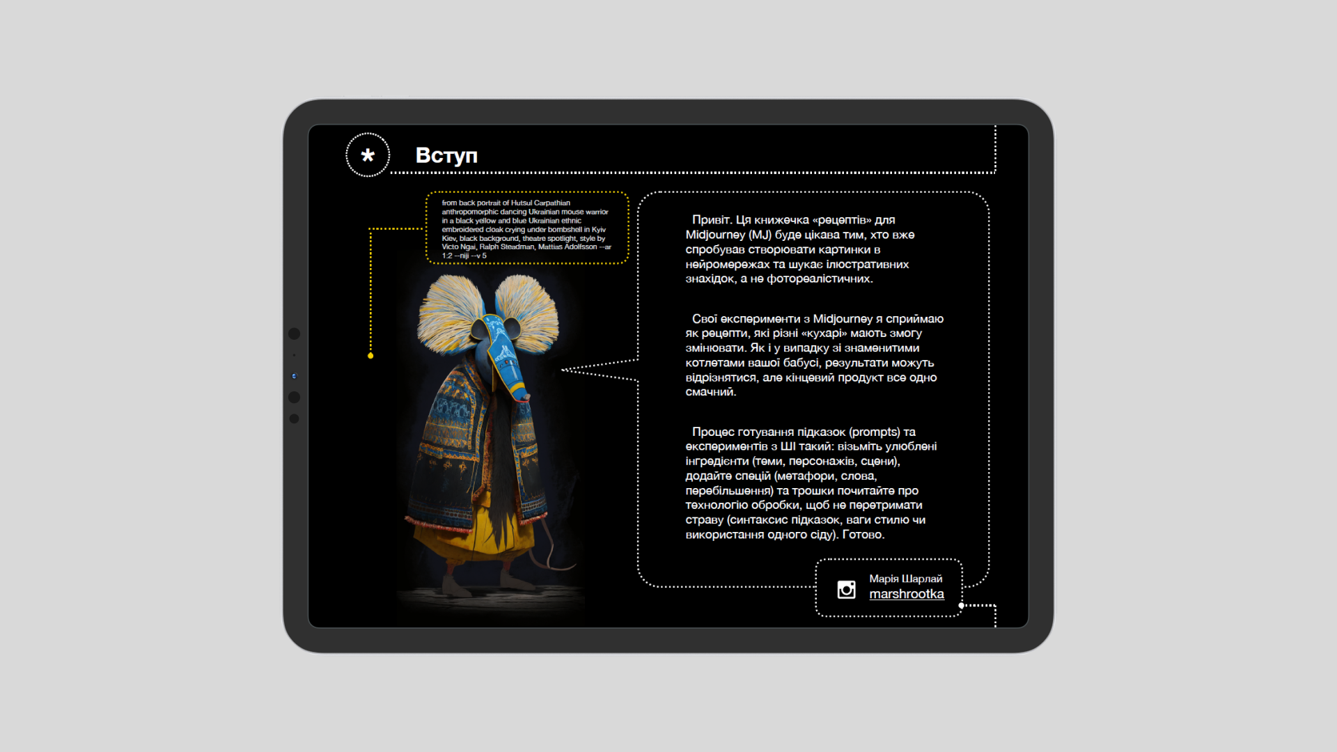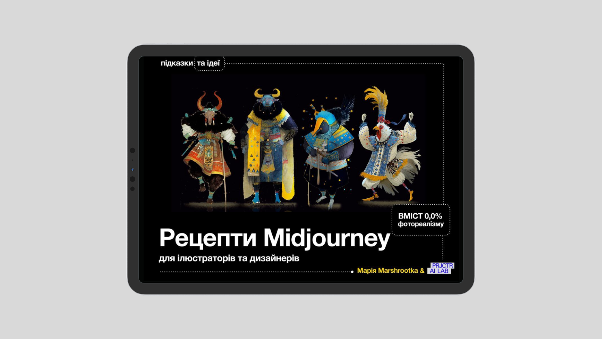 «У цій книжці я зібрала те, що знаю про зображення я і що поки не знає алгоритм чи інструкція. Посібник зацікавить тих, хто вже спробував робити картинки з Midjourney та прагне саме ілюстративних, а не фотореалістичних експериментів», – авторка Марія Шарлай «Marshrootka».