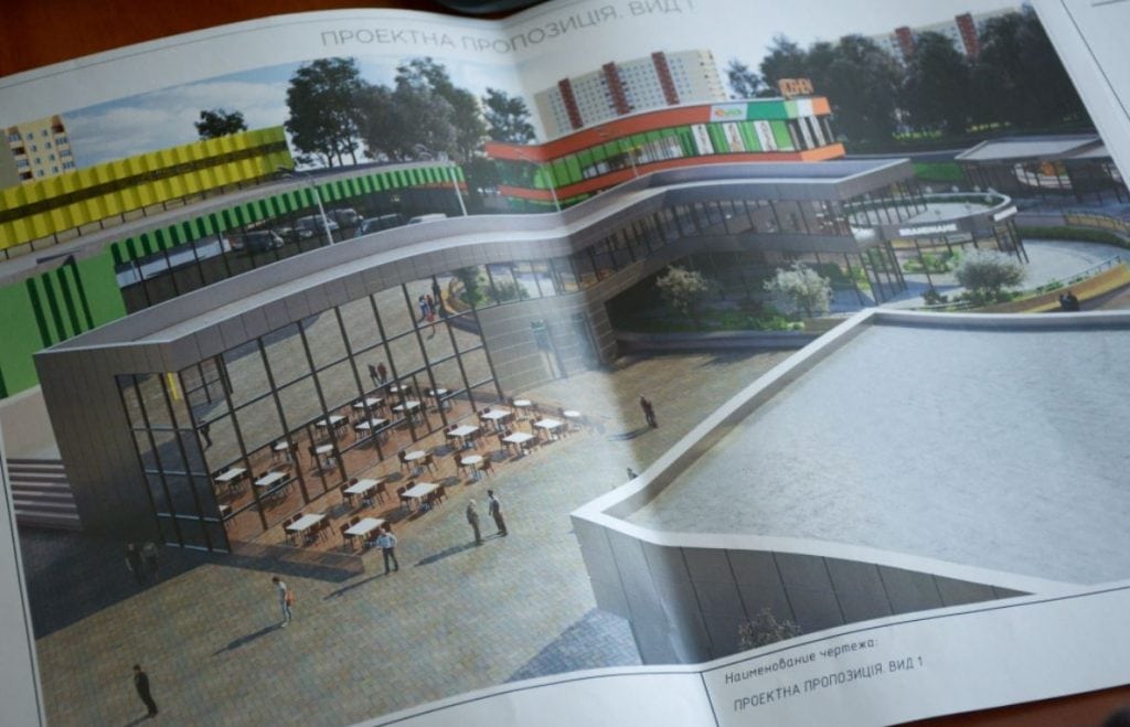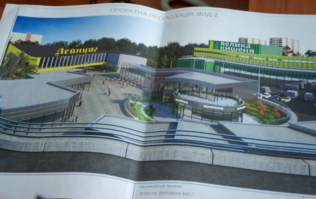 Це лише чорновий варіант візуалізації наразі відбуваються обговорення щодо  розташування торговельних закладів на території.