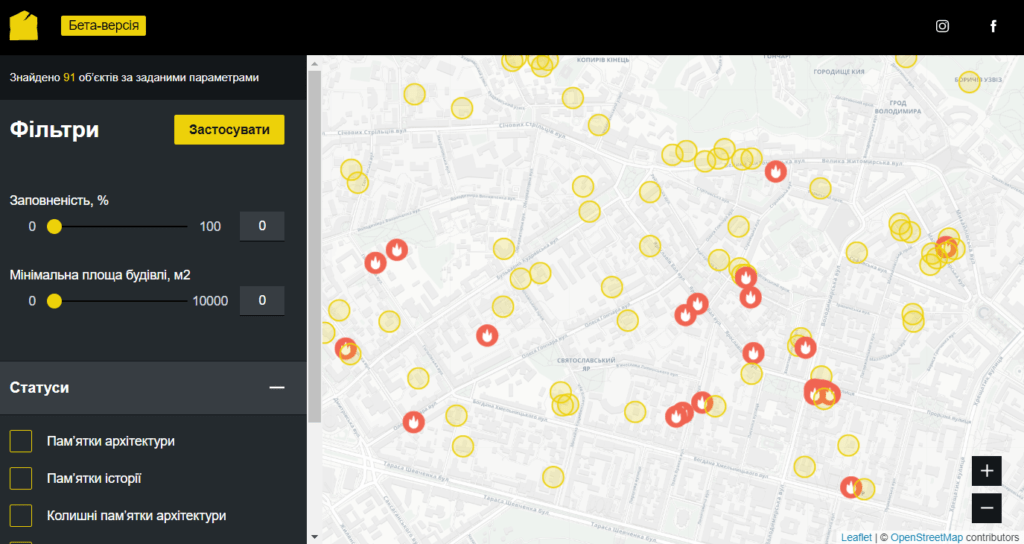 Наразі на карті можна знайти тільки об’єкти в Шевченківському районі. Загалом в базі 227 покинутих будівлі, 66 з них — пам’ятки архітектури.