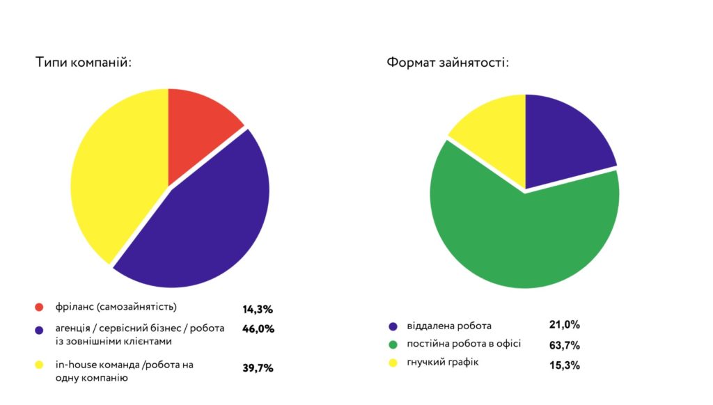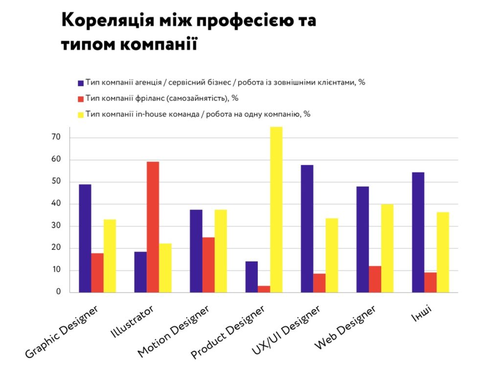 За даними опитування, більшість продуктових дизайнерів працюють в in-house команді на одну компанію. Фриланс найбільш популярний серед ілюстраторів, а UX/UI дизайнери надають перевагу роботі із зовнішніми клієнтами.