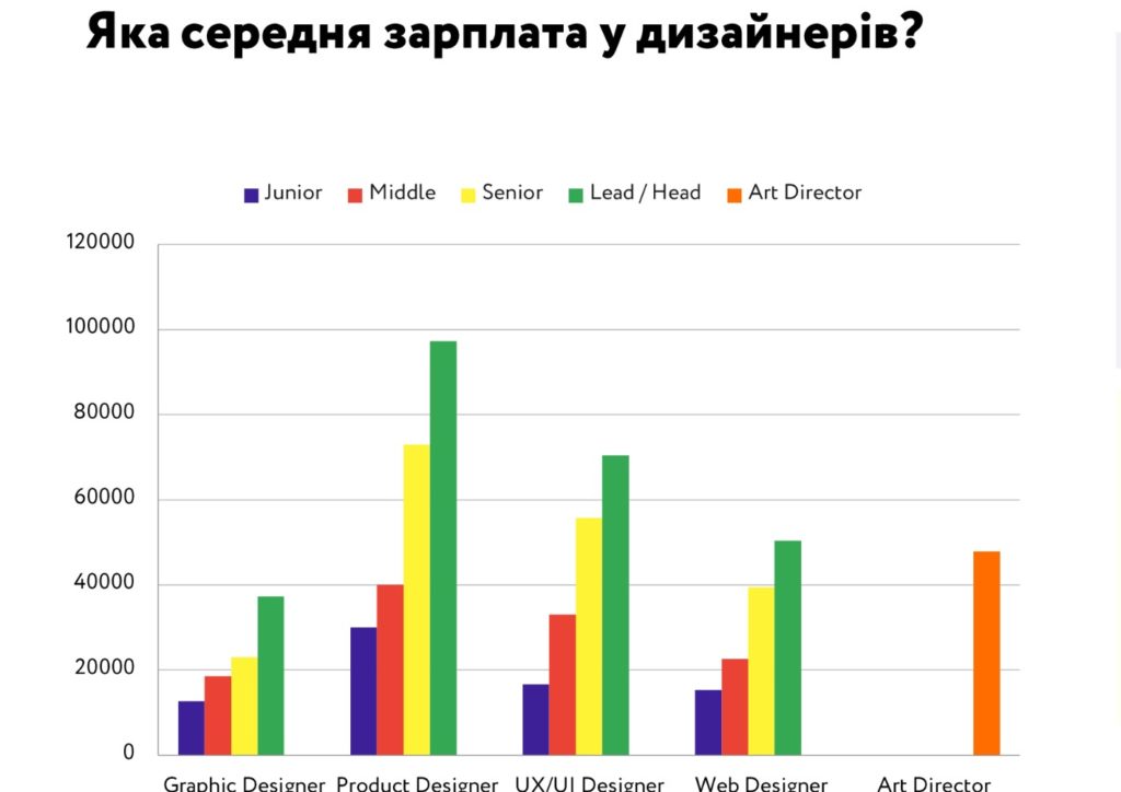 Найбільше у сфері заробляють продуктові дизайнери. Для спеціаліста рівня junior середня зарплата становить 30 000 грн, для senior — 73 000. Найнижчі заробітки мають графдизайнери — від 12 700 грн для junior до 23 000 грн для senior.