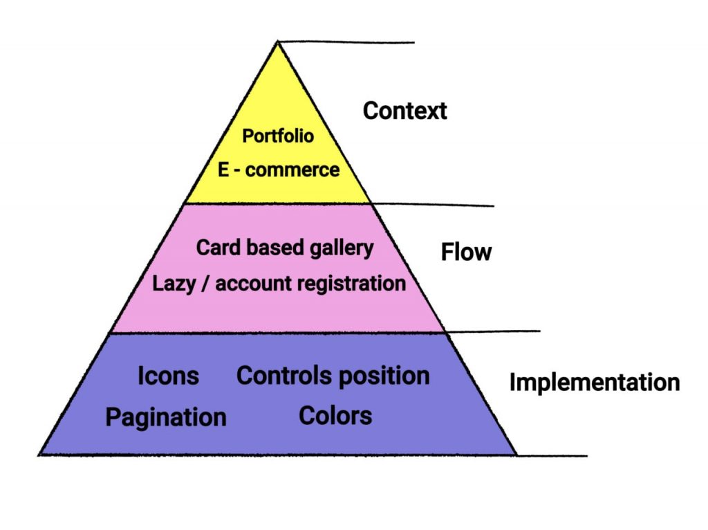 «Контекст», верхній рівень, спирається на загальну спрямованість ресурсу — це може бути сайт охорони здоров’я чи бізнесу, стимул здійснити покупку чи інформаційний ресурс. Дослідження цільової аудиторії дає уявлення про доречність стилів.
