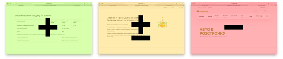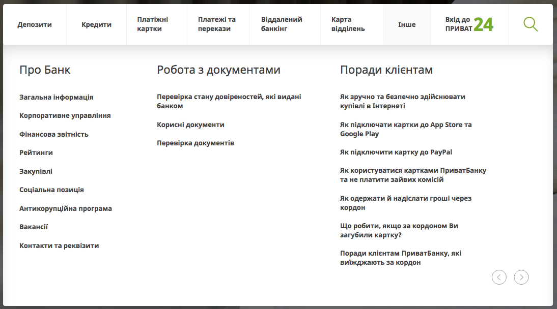 Внутри самого меню, правда, нет четкой структуры. Например, под «Кредити» можно найти полный список кредитных программ, а под «Депозити» — нет. Для этого нужно пойти уже в «Як обрати депозит?». Значит, либо архитектура была плохо продумана, либо еще в процессе становления. Тут ставим минус от клиента (за усложнение понимания) ?, и минус от банка (за сложность наполнения и поддержки) ?.