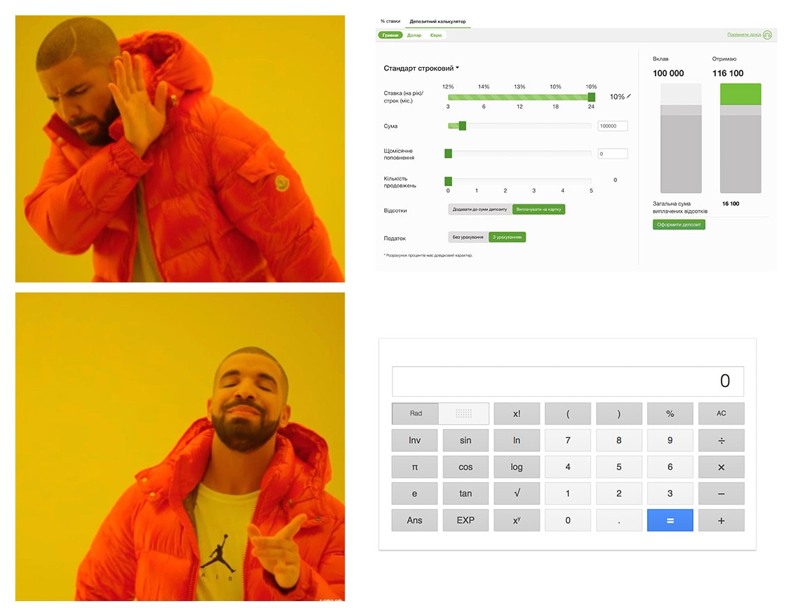Зато нашел спрятанный за маленькой ссылкой депозитный калькулятор! ☕️ Благодаря калькулятору я понял, что налог на прибыль по процентам с депозита в Украине составляет 19.5%(!). Но понял я это благодаря калькулятору в айфоне, а не на сайте Приватбанка. Внешний вид обсуждать бесполезно, а вот механика заслуживает пары слов: мучения и жалость. Мучения испытывают пользователи, а жалость за них испытываю я.