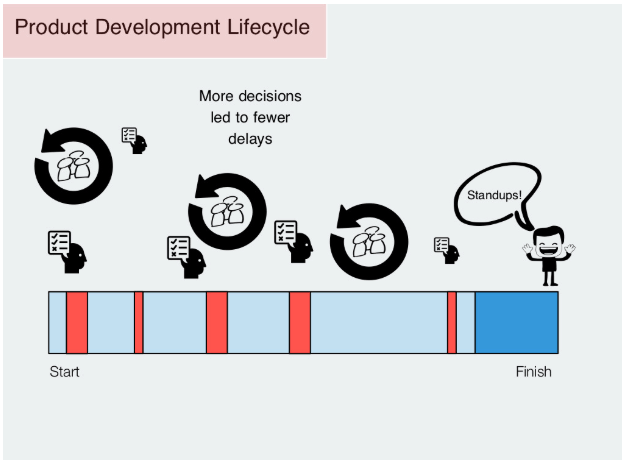 Запитання без відповіді під час розробки продуктів – ніщо інше як лежачі поліцейські на шляху у розігнанної машини. Класичний приклад – команда має вирішити, які функції будуть включені або виключені з MVP. Це важке рішення, яке необхідно прийняти, тому команди зазвичай цю фазу розробки проходять повільно. Але кожне неприйняте рішення (тобто кожне запитання без відповіді) гальмує процес розробки в цілому. Затяжне прийняття рішень призводить до довгих циклів розвитку продукту – тижні та місяці тупцювання на міці (позначені червоними рядками нижче).