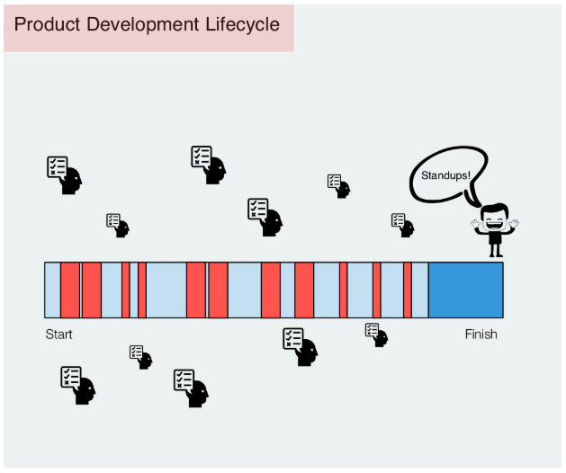 Єдиний час, коли стендап – це насправді корисна зустріч – перед самим запуском продукту. Це той час, коли вам необхідно впевнитися, що всі ланки готові. Чи ми готові запускати A/B тести? Чи готові хлопці з маркетингу публікувати пост про запуск і пушити PR-інструменти? Чи є у служби обслуговування клієнтів необхідні сценарії, аби відповідати на питання, які з’являться відразу після запуску?