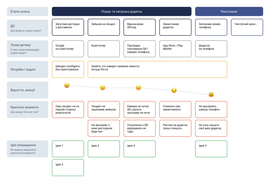 Корисно вказувати критичні моменти на кожному кроці, емоційний стан користувача. Ці рівні допоможуть знайти необхідні рішення для продукту. Наприклад, якщо у формі реєстрації в додатку користувач більше незадоволений, ми можемо в кінці форми підготувати для нього анімашку або підбадьорюючий текст. Застосувати емоційний дизайн.
