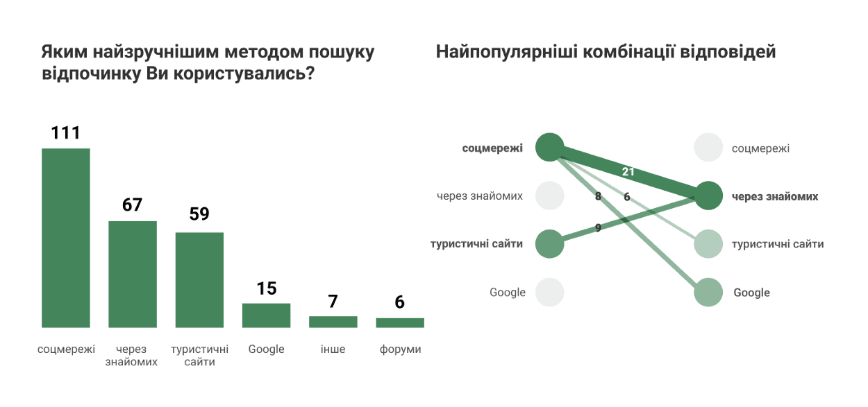 Щоби краще зрозуміти потреби цільових аудиторій ми провели кількісне та якісне дослідження. Проведення кількісного дослідження серед потенційних туристів точніше сформувало уявлення про те, які ключові потреби має задовольняти платформа та яку цінність нести для людей. Опитування було сформоване у Google Forms та поширювалося в соцмережах, індивідуально та в тематичних групах. За кілька днів наше опитування пройшло 222 людини. Проаналізувавши дані ми отримали такі результати: