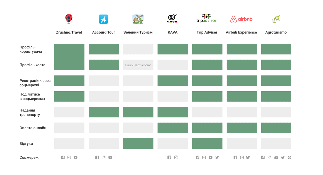 Щоби побачити загальну картину розвитку сільського туризму на українському ринку та порівняти ситуацію з європейськими аналогами, ми провели аналіз конкурентів. Ми порівняли чотири вітчизняні компанії та три міжнародні й зрозуміли, що сільського туризму на українському ринку майже немає.