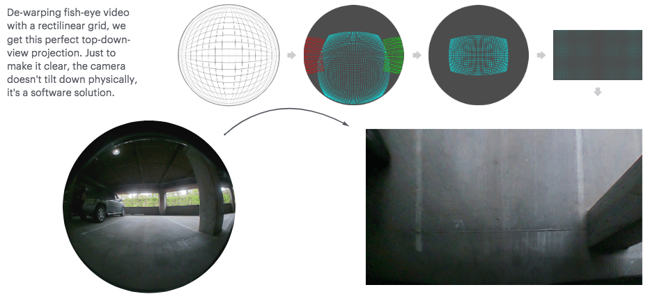 Устранив оптические искажения на видео с эффектом рыбьего глаза с вертикальной сеткой, мы получим идеальную проекцию виду сверху вниз. Чтобы прояснить, камера не наклоняется физически, это программное решение.