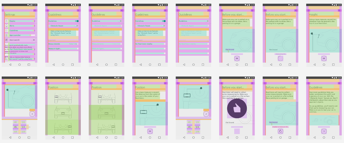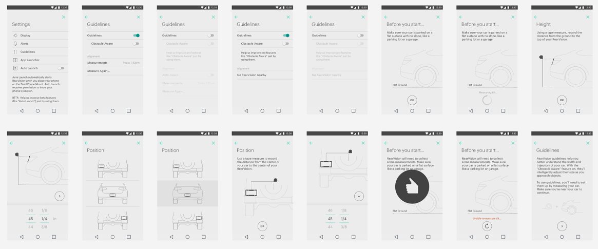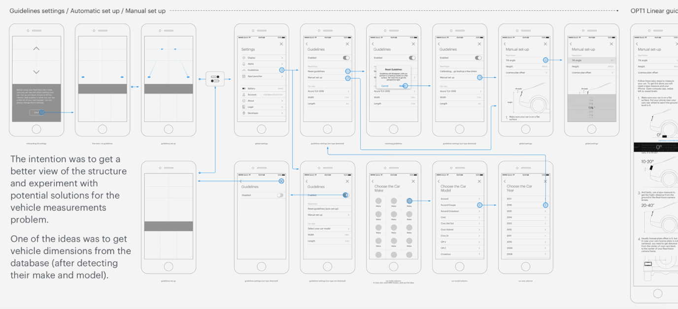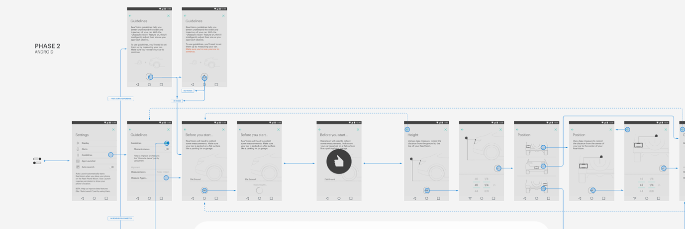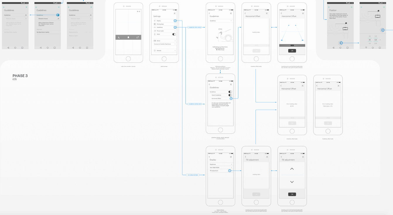 После фазы исследования, я повторил то же с UI и визуальным дизайном для функции умного руководства по парковке и его пользовательского опыта на iOS и Android. Чтобы улучшить и проверить наши дизайн решения, я провел еще раз лабораторные тесты. Финальная user journey была интегрирована в глобальную UX архитектуру RearVision.