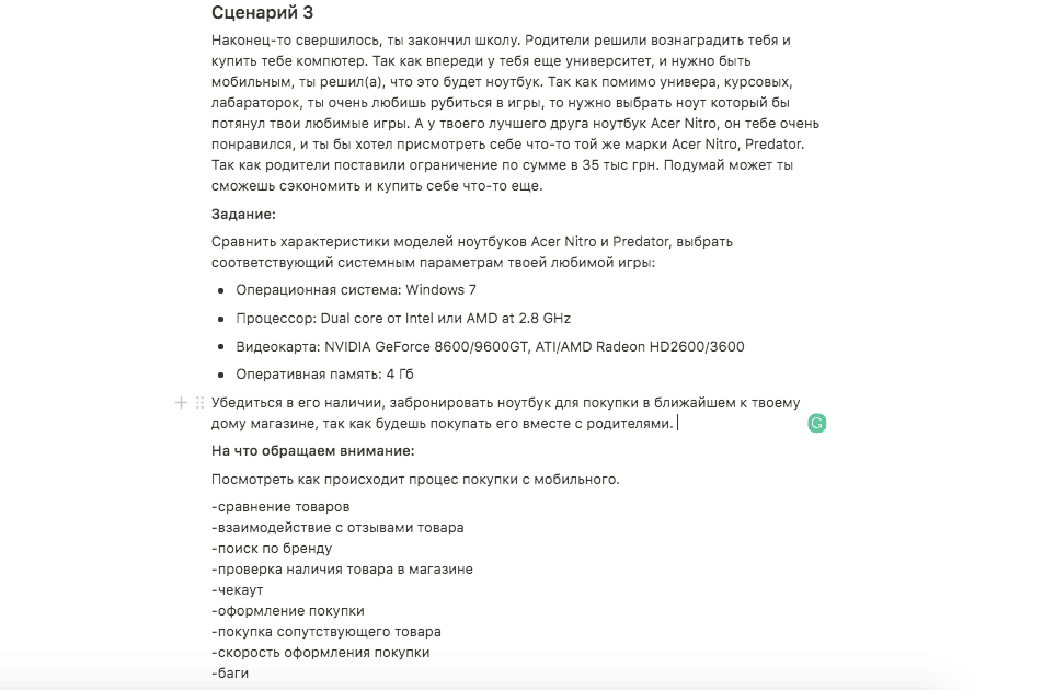 Для кожної з груп написали сценарій, аби якомога сильніше залучити людей у процес і викликати емпатію. Це була детально описана передісторія покупки і завдання, яке учасники мали виконати. Кожне із завдань ми розділили на проміжні етапи, це допомогло нам зрозуміти проблемні ділянки інтерфейсу.