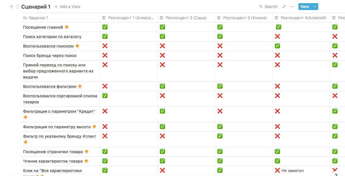 За кожним сценарієм ми побудували таблицю, яка включала всіх учасників групи. У таблиці ставили позначки: ✅— якщо завдання виконано успішно і ❌— якщо не виконано. Також в таблицю заносили час на завдання і загальний час на покупку.