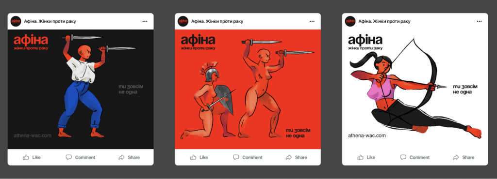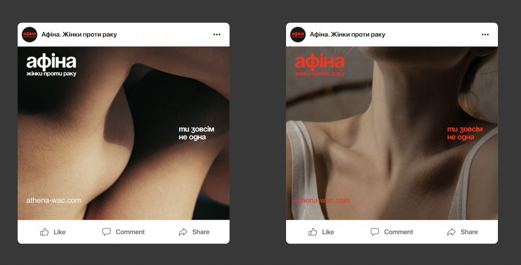 Партнера шукали сарафанним методом. Запитали знайомих, зібрали декілька потенційних організацій, написали листи: хочемо зробити кейс для себе, ось наше портфоліо, давайте зробимо вам айдентику. Громадська організація «Афіна. Жінки проти раку» відповіла швидше за всіх (майже одразу), решта реципієнтів не відповіли зовсім. Ми домовились зустрітися і забрифуватись на задачу.