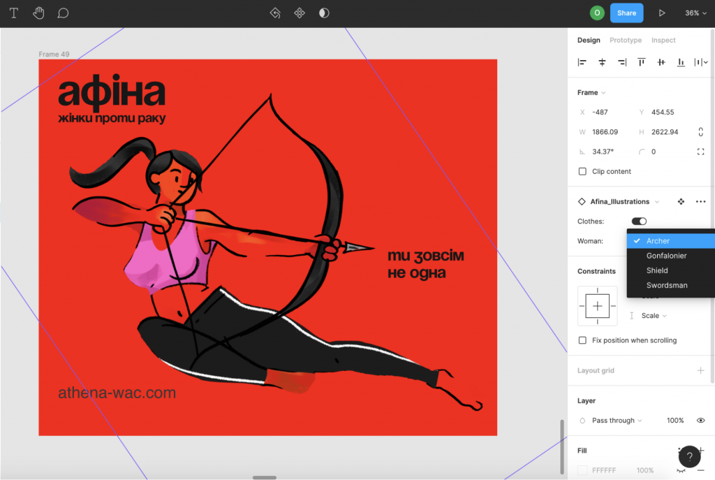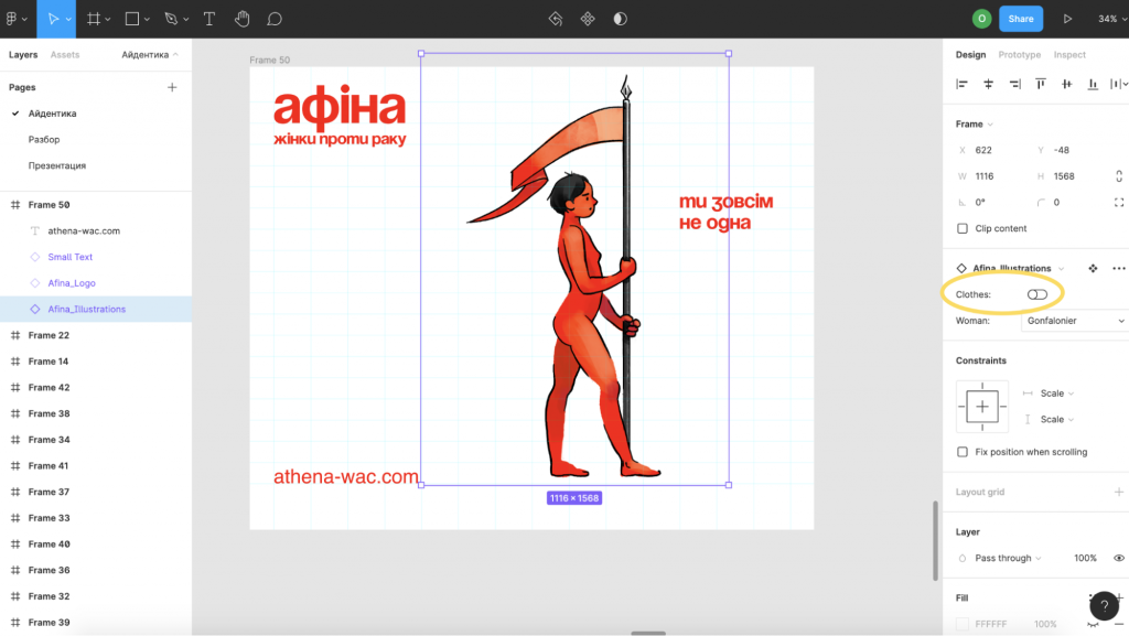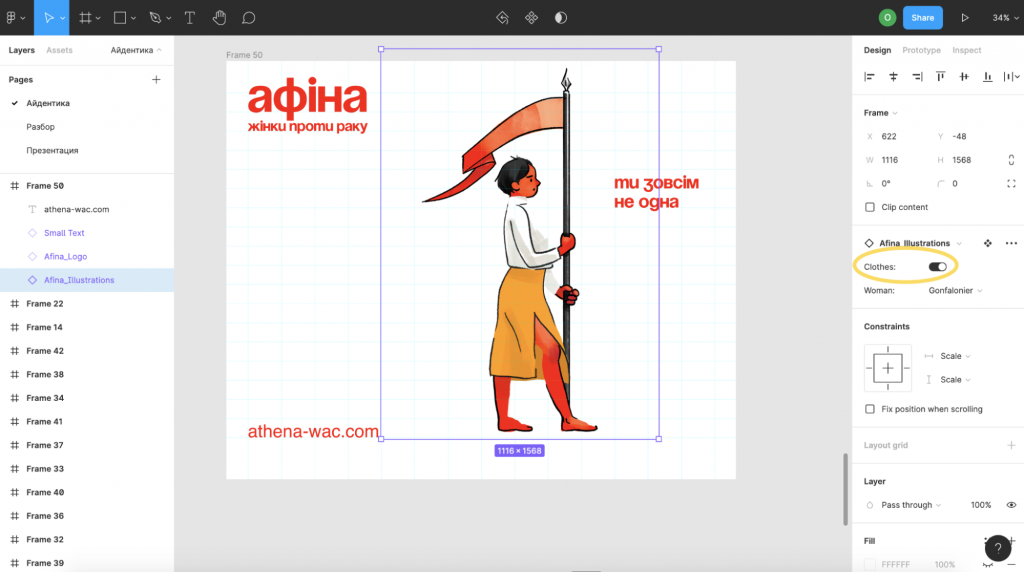 Ми доробили ілюстрації та виконали ще декілька побажань «Афіни» і почали готувати матеріалі до передачі. Усе підготували так, щоб неможливо було зламати. Ми створили figma-документ з усім необхідним для створення публікацій і дзеркально підготували макети для друку. Усі дизайн-елементи у Figma були автоматизовані, просто треба взяти макет, зробити нову версію, підтягнути відповідний елемент і готово.