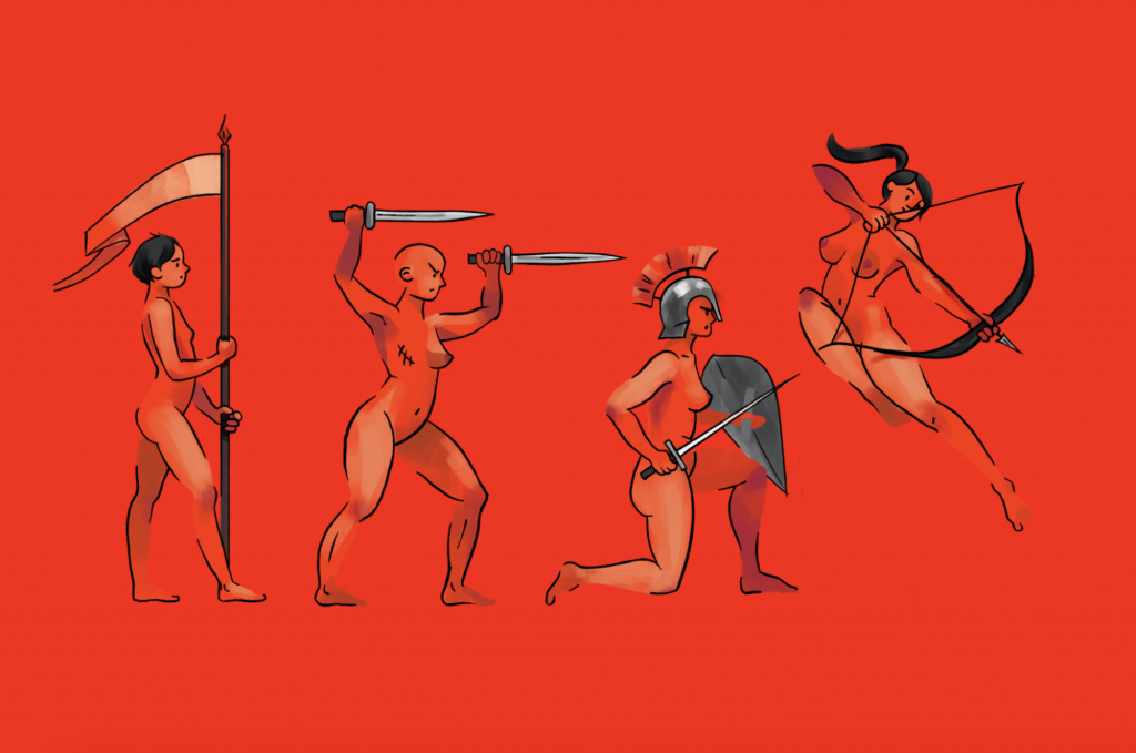 Ця ідея продовжує античну тему. Ми запропонували намалювати ілюстрації, які будуть зображати афінянок як героїв міфів. Таким чином ми прагнули зробити потужний і гучний образ.