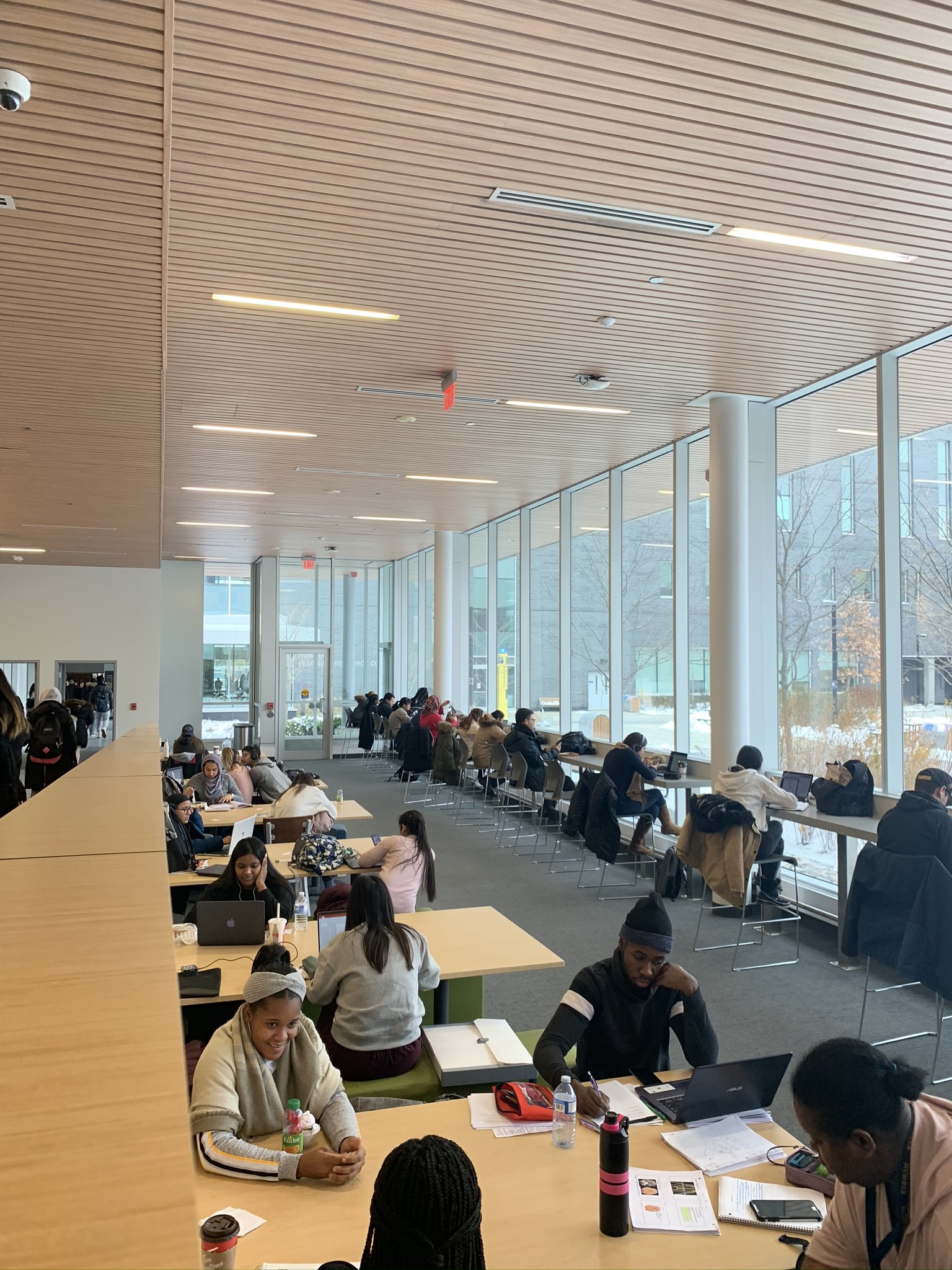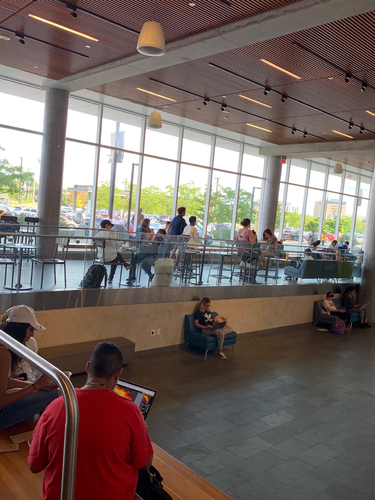 Коридор коледжу зі столами та диванами. Тут можна вчитися, спати, їсти, працювати, годувати дітей тощо
